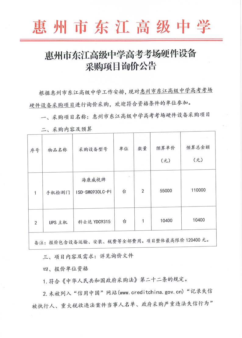 惠州市东江高级中学高考考场硬件设备采购项目询价公告 来源: 发布时间:2025-12-11 09:40:05 浏览次数: 次 【字体:小 大】 惠州市东江高级中学高考考场硬件设备采购项目询价文件.doc 分享到: 【打印正文】